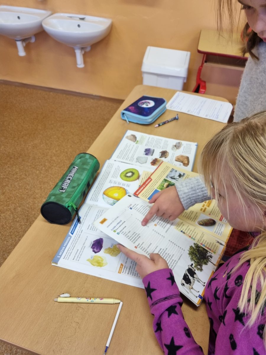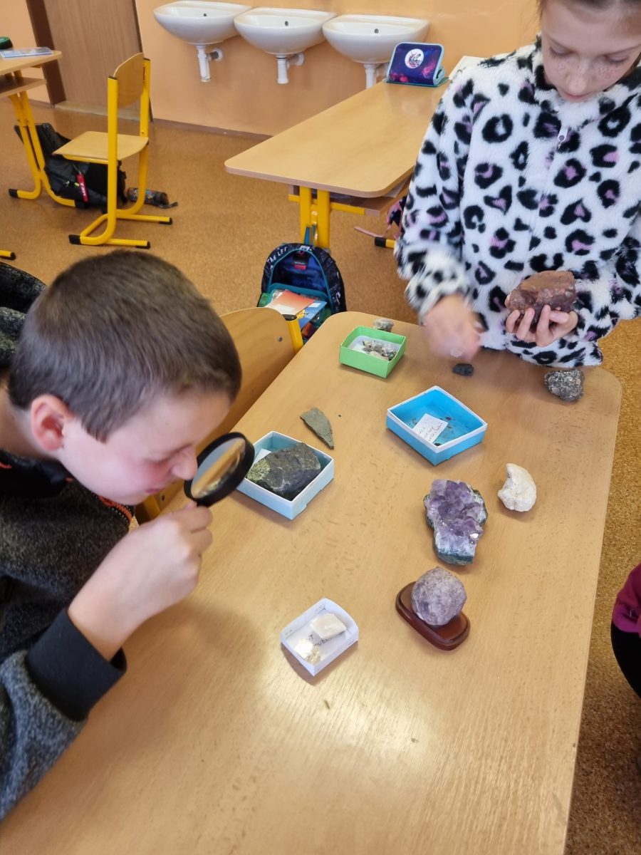 Čtvrťáci a páťáci se na chvíli proměnili v nadšené badatele a vědce. Společně se vydali do fascinujícího světa hornin a nerostů. S pomocí lupy zkoumali různé minerály a horniny například žulu, čedič, břidlici, olivín či krásný ametyst a učili se rozpoznávat jejich vlastnosti. Součástí programu bylo také poznávání nerostných surovin. Žáci se dozvěděli, kde v přírodě tyto suroviny najdeme, k čemu slouží, proč jsou pro člověka důležité a jak může jejich těžba zároveň škodit životnímu prostředí. Nechyběla ani práce s učebnicí, která jejich výzkum doplnila o nové poznatky.