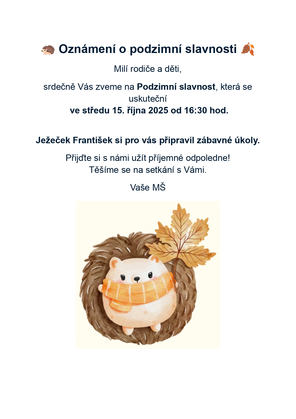 Říjen v MŠ5.10.2025Divadelní představení – Trápení chameleona Leona8.10.2025 Podzimní slavnost Další zprávy14.11.2025Vánoční cukrovíČíst více7.11.2025Listopad v naší školceČíst více5.11.2025Říjen v naší mateřské školeČíst více