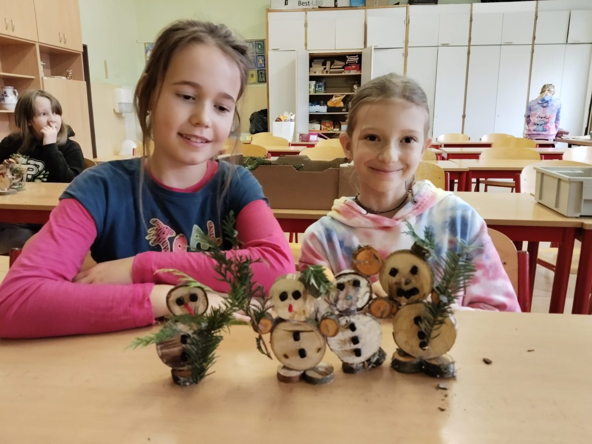 Ve čtvrtek 18. 12. měli žáci za úkol na hodině pracovních činností vytvořit z dřevěných koleček, jedlových větviček a korálků vánoční ozdobu. Hodina se všem moc líbila, děti se zápalem a radostí popustily uzdu své fantazii a vytvořily krásné milé sněhuláčky a další vánoční výrobky.